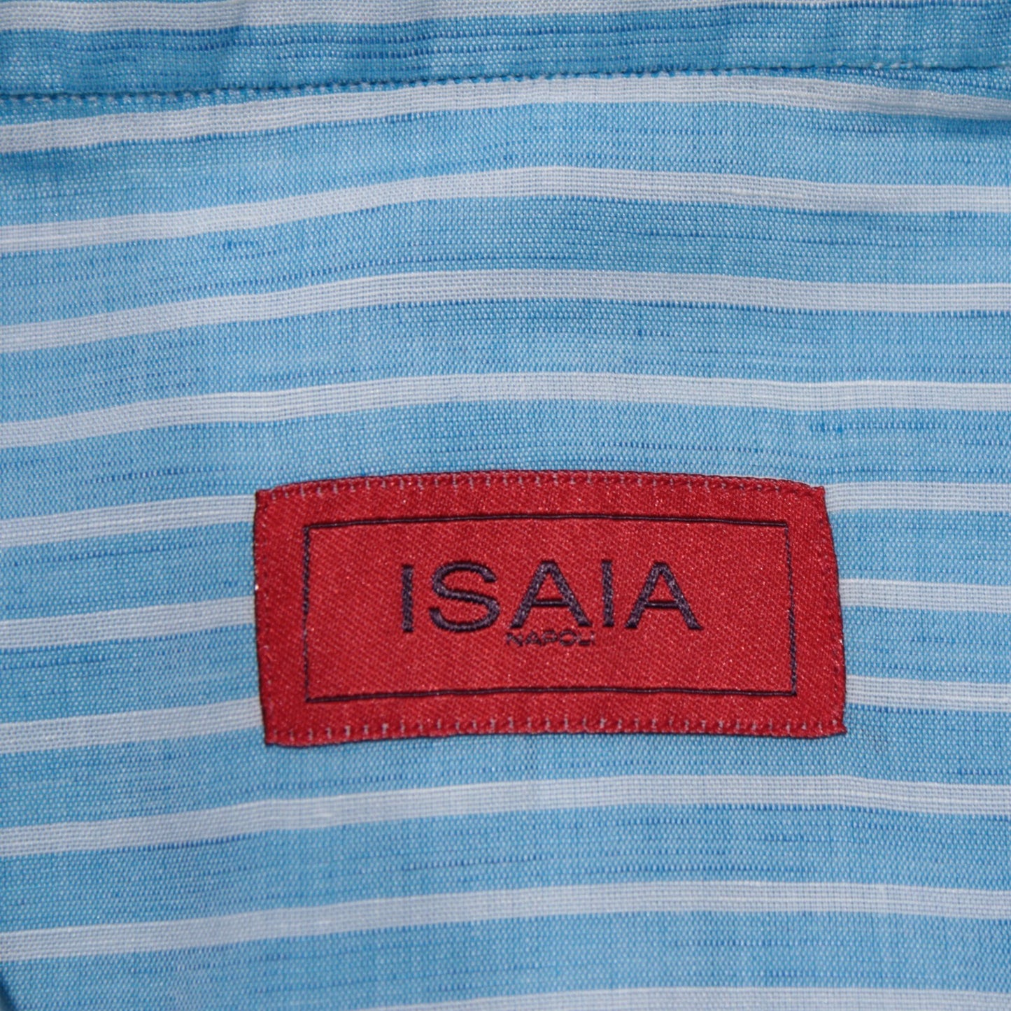 Isaia NWT Dress Shirt Size 17.5 44 in Blue & White Stripes Cotton & Linen Blend