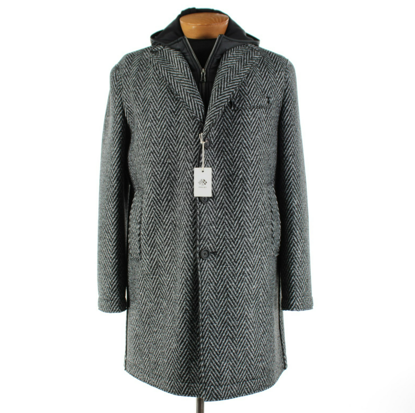 Caruso NWT Hooded Coat Size 44C (42S US XL) Ernani Gray Herringbone Wool Blend