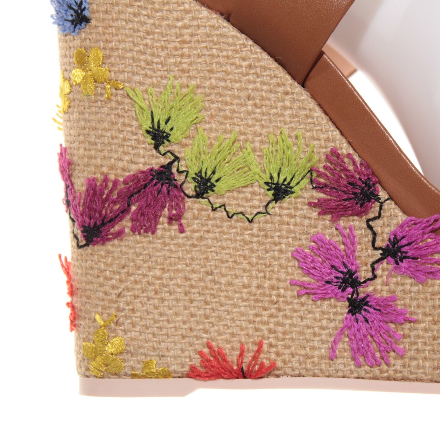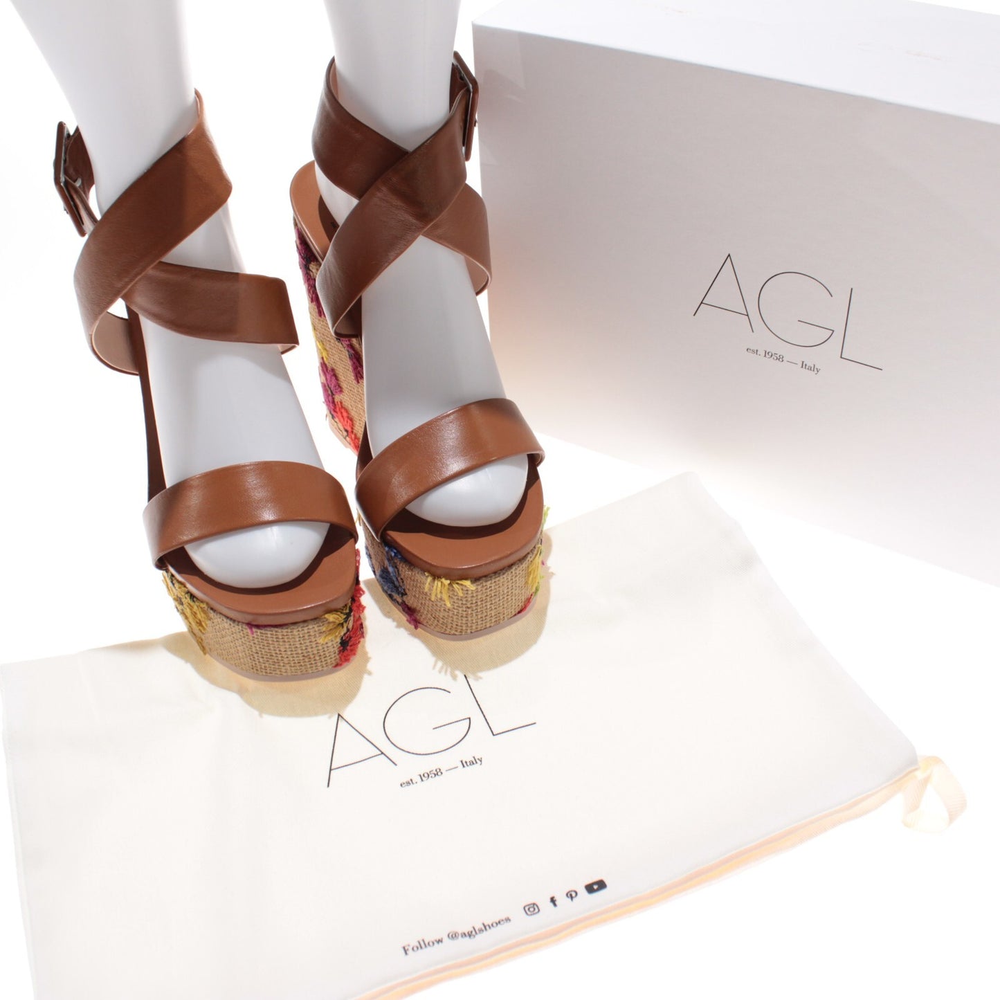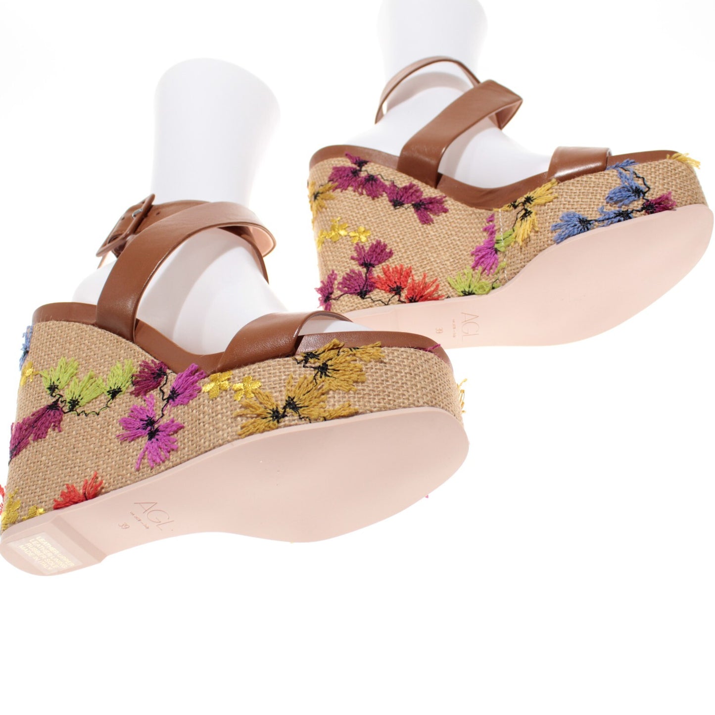 AGL NWB Holly H Embroidered Wedge Leather Sandals Size 39 US 9 in Brown/Multi