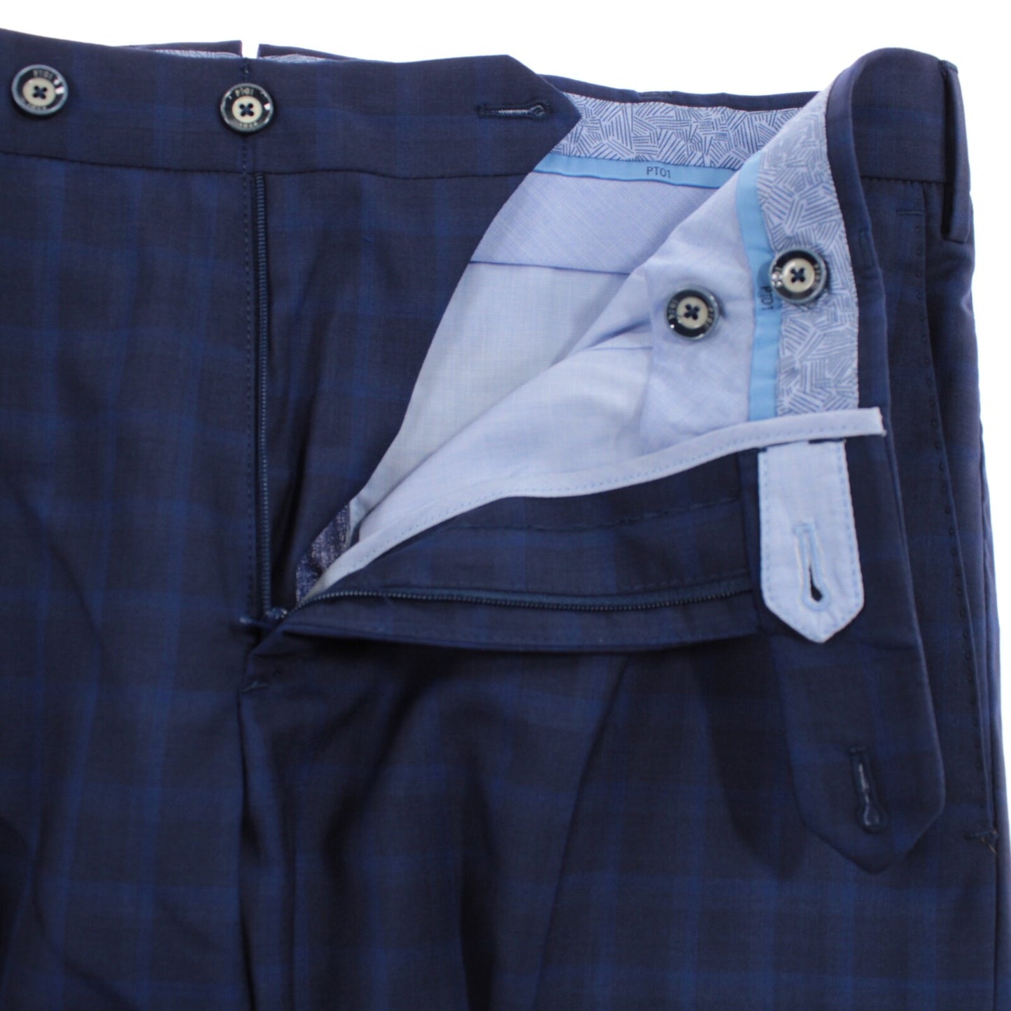 PT01 NWT Flat Front Dress Pants Size 48 32 US Dark Blue Plaid Wool Blend